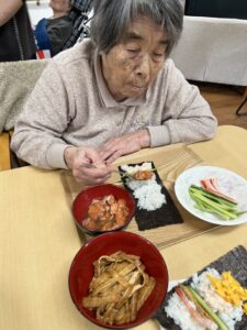 具材はツナ、卵、サーモン、きゅうり、カニカマ🦀、甘エビ🦐好きな具材を選んで巻いてもらいました。