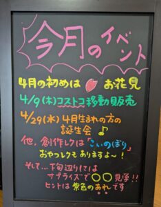 9日のコストコ販売は、販売員さんのご都合により中止になりましたが…今月も何やらイベント盛りだくさん!!楽しみいっぱいの4月になりそうです🤩✨✨