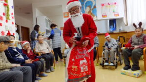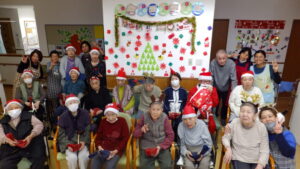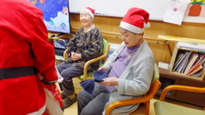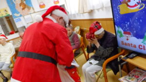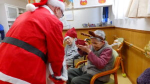 会場がクリスマスの飾り付けで彩られる中、なんと今年は入居者様がサンタクロースに