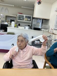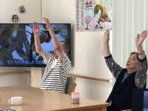 音楽に合わせて体を動かすリハビリ体操では、笑顔いっぱい!