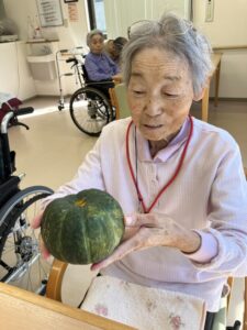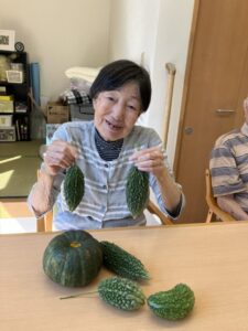 施設のお庭の畑で育てたカボチャやゴーヤが、立派に実りましたヽ(^o^)丿