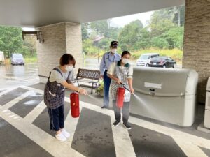 まずは屋外にて、職員が消火器の使い方を確認しながら消火訓練を行いました🧯