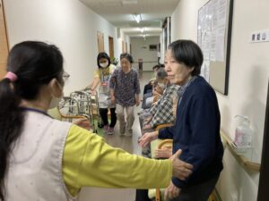 職員が声をかけながら、安全に配慮して廊下へ誘導。入居者様も真剣な面持ちで参加され、