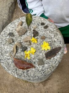 貰った木の実や花を並べ、大事にホームまで持って帰ったりと