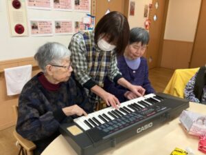 実は元ピアノの先生🎹 ご利用者様と一緒に歌ったり演奏に参加してもらったり