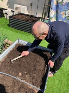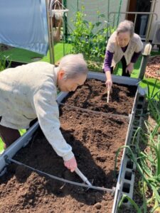 まずは畑仕事のお手伝いです。鍬の手やスコップを使って土を耕し、「よいしょ!」と声を出しながら、自然に触れながら作業して頂きました。