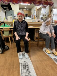 新聞紙を引き寄せていました。職員の「頑張れ!」の声