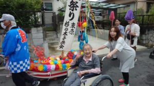 車椅子に乗った利用者様も、飾り付けられた船型の山車を引