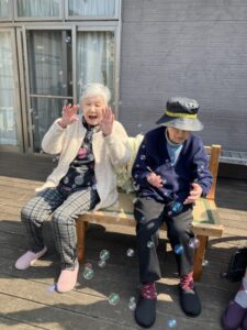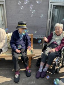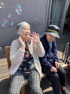 ウッドデッキで職員と一緒にひなたぼっこをしながら、シャボン玉を楽しみました☀️🫧 やわらかな春の日差しの中、ふわふわと舞うシャボン玉に自然と笑顔がこぼれ、気がつくと「シャボン玉」の歌を口ずさむなど、穏やかで楽しいひとときとなりました🎶😊 中庭に顔を出していたつくしも眺めながら、春の訪れを感じることができました🌱🌸