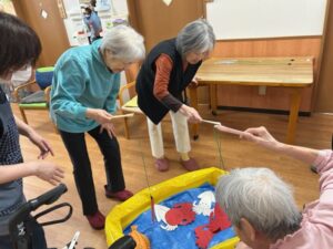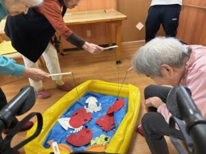 手作りの金魚釣りゲームでは、「そーっと、そーっと…あっ、釣れた!」と笑顔がはじけました🐟