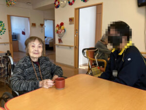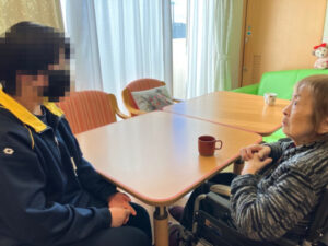 はじめは少しドキドキしている様子でしたが、「こんにちは!」と元気にあいさつしながら、利用者様と楽しそうにお話しされていました。