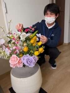 豊田青木スタッフ一同(3月組)が揃い、いただいたお花の前で記念撮影📷