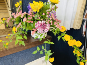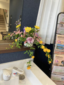 今日、玄関の手洗い場の前に素敵な生花が飾ってありました。