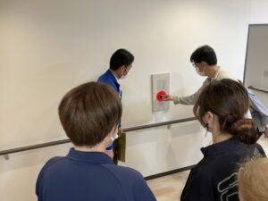 通報訓練では、館内の非常通報装置の使い方を確認し、 実際の流れに沿って操作を行いました。