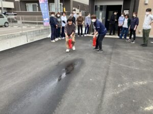 また、消火訓練では屋外にて消火器を使用し、模擬消火を行いました。 初めて扱う職員もおりましたが、声を掛け合いながら操作方法を確認し、 安心して対応できるよう練習しました。