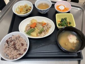 ほくほくとした肉じゃがに、彩りの良い副菜、 そしてお祝い🎊の席にもぴったりな赤飯を組み合わせた、 どこか懐かしく、ほっとする味わいのお食事となっています。