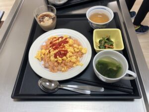 ふんわりとした卵とケチャップのやさしい味わいが特徴で、 見た目も明るく、楽しくお召し上がりいただける一品となっています。 デザートも添えられ、食事の時間がより楽しみになる内容です。