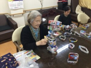 チラシ広告で作った輪っかを、時間内に高く積み上げていきます。