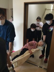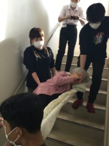 今回車椅子の方は実際の防災で対応できるよう避難用担架にて避難を行いました。