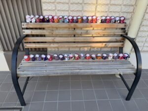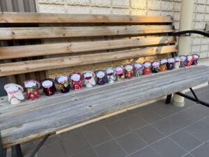 ベンチに並んだ笠地蔵さん(‘ω’)ノ
