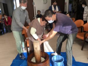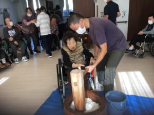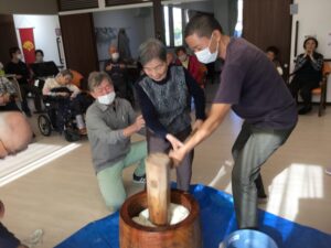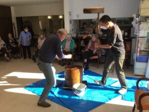 「昔はこうやって家でお餅ついたよね」「懐かしいね」とご利用者様から