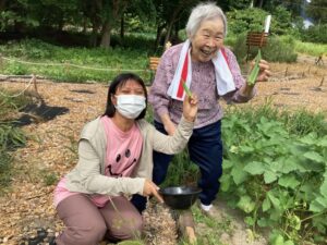 利用者様と一緒に「こんなに大きくなったのね!」と驚きの声をあげながら、笑顔で収穫。