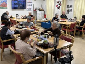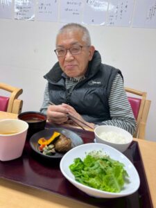 賑わう食堂。ハンバーグと特製ソースとの絡みが入所者の皆様から大好評でした。