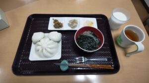 メニューは肉まん・ワカメスープ・焼売・ザーサイ・ミックスフルーツ