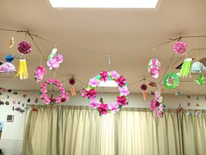 まずは景気付けに、食堂天井飾りの作成!!