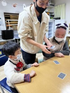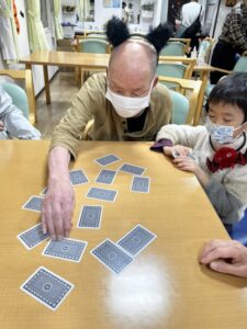 ハロウィンのお菓子を渡した後は、一緒にトランプをしてくれました。
