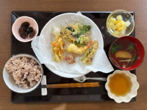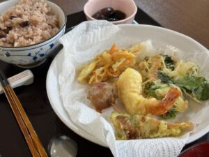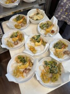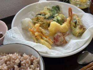 海老、にんじん・ごぼうのかき揚げ、紫蘇、ちくわ、肉巻きトマト(斬新!)